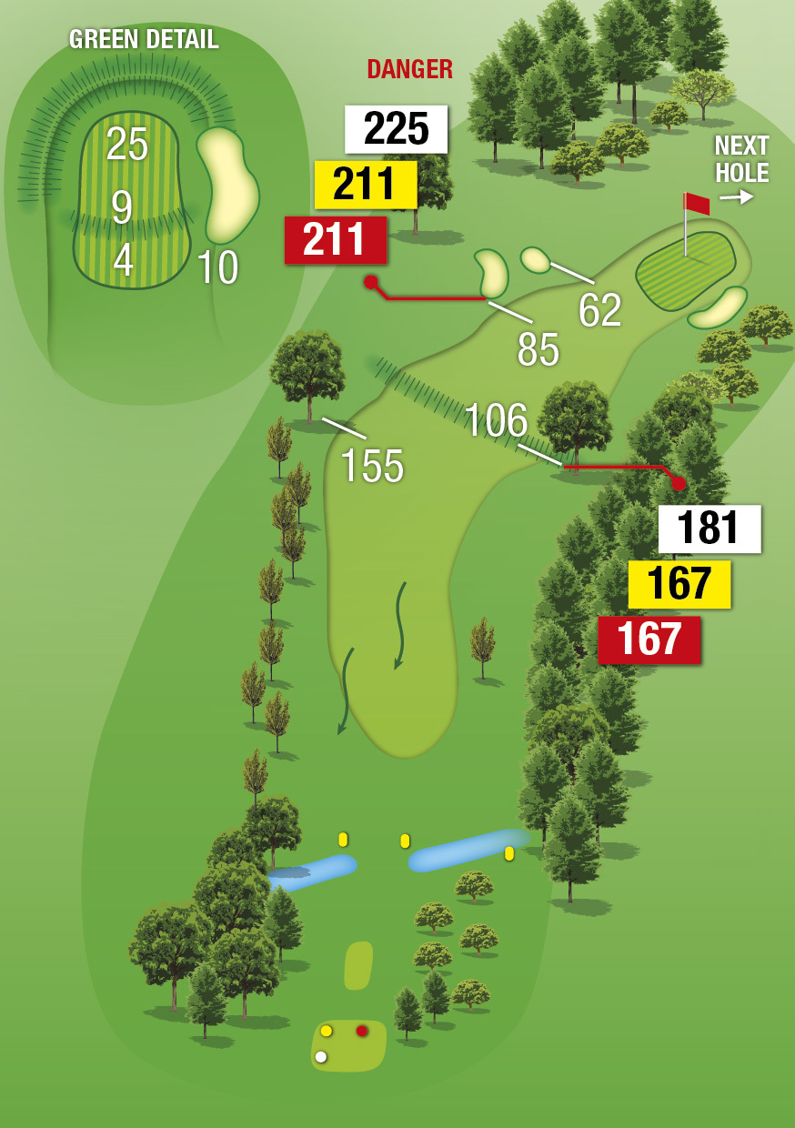Clubbing is all important into a green slightly raised with a tricky front ridge. Trust your yardage because the base of the pin generally cannot been seen.