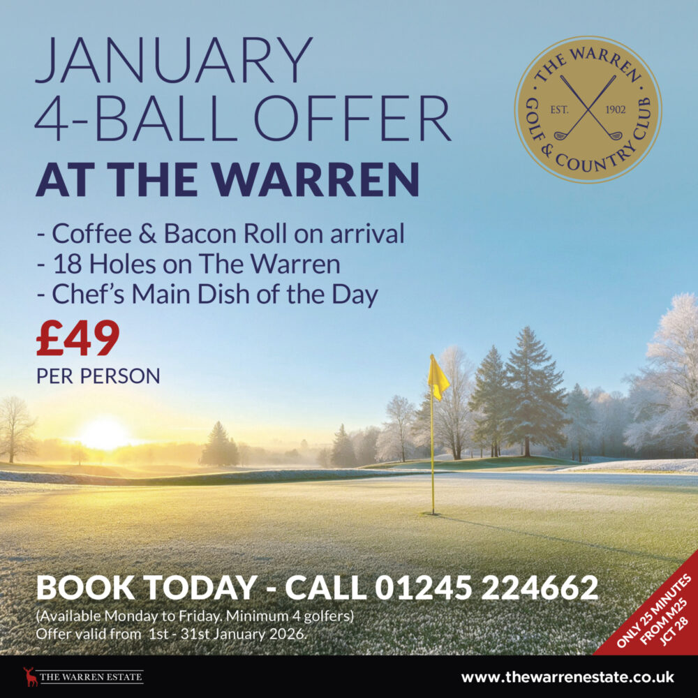 *Terms & conditions apply. Offer available anytime midweek (Monday - Friday). Please book tee-times in advance. Price is £49 per person. Only available to groups of four or more players. Offer valid 1/1/2026 to 31/1/2026. Not in conjunction with any other offer.