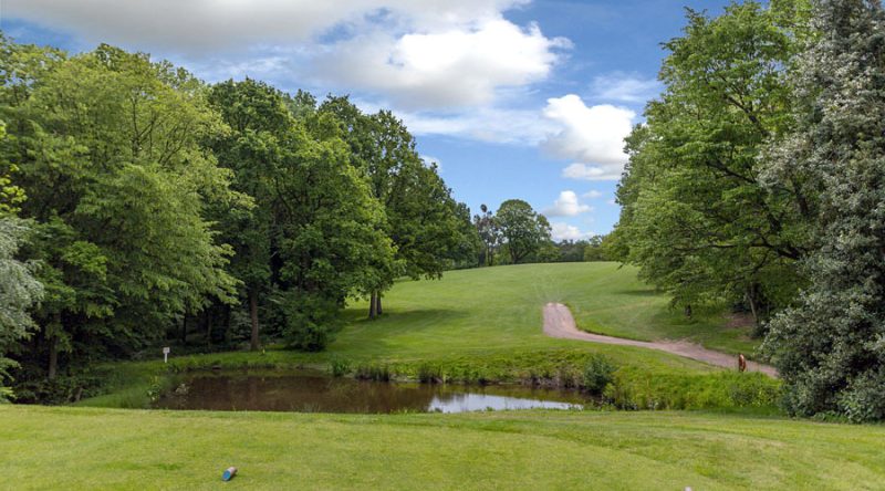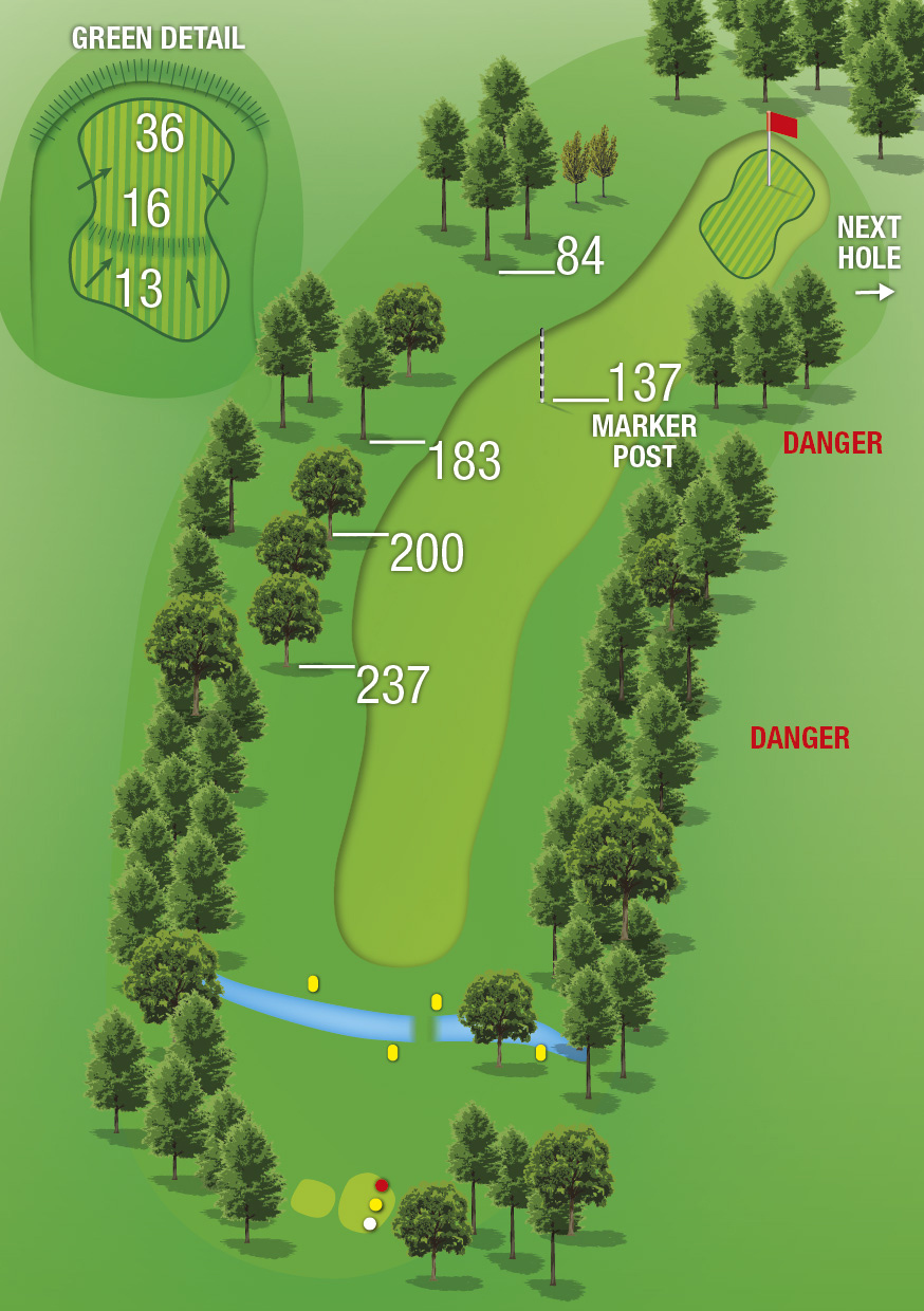 A blind shot that can always be played further right than you think. Often made more difficult if you are playing from the swales on this fairway.