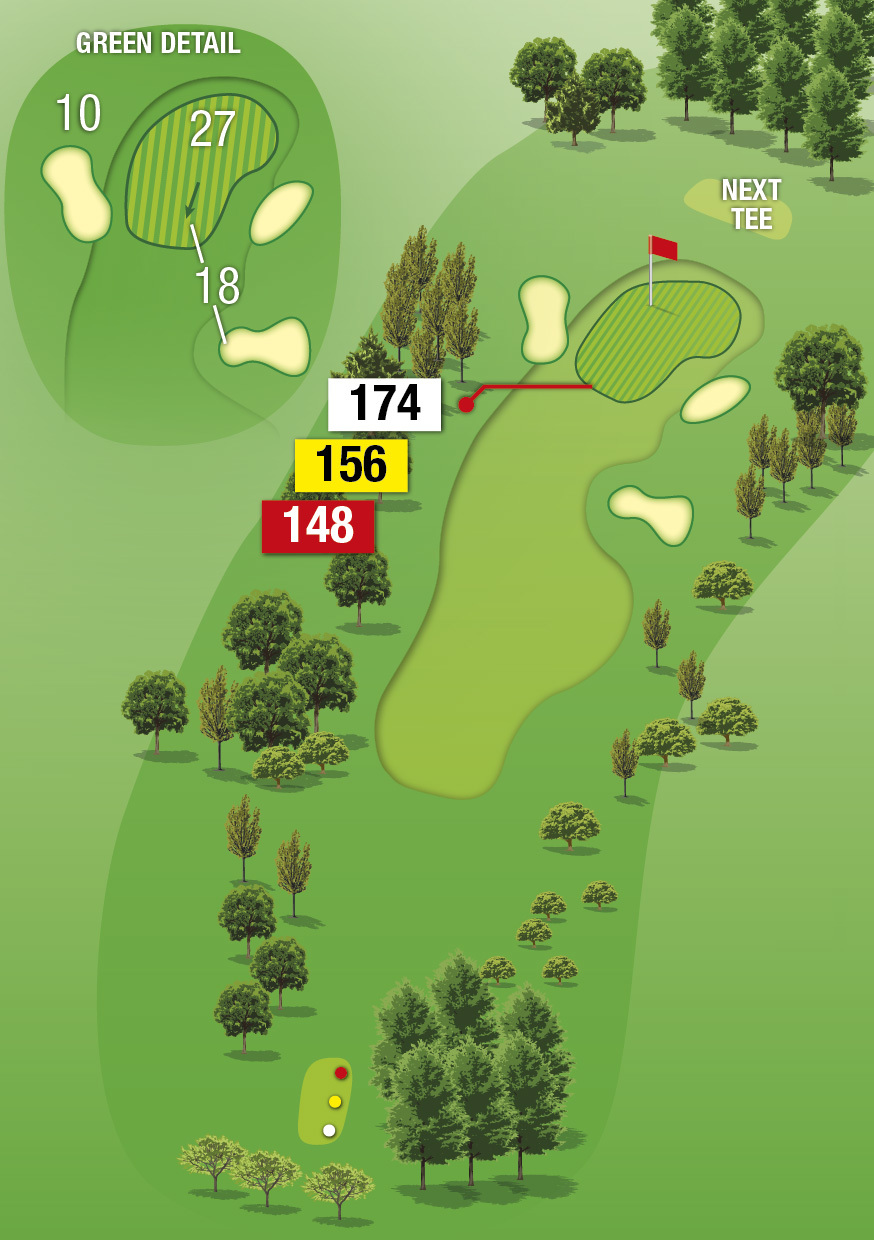 A prevailing wind from the left means a shot drifting to miss right is common. If you land the ball just short and right of the left hand bunker it will generally finish in the centre of the green.