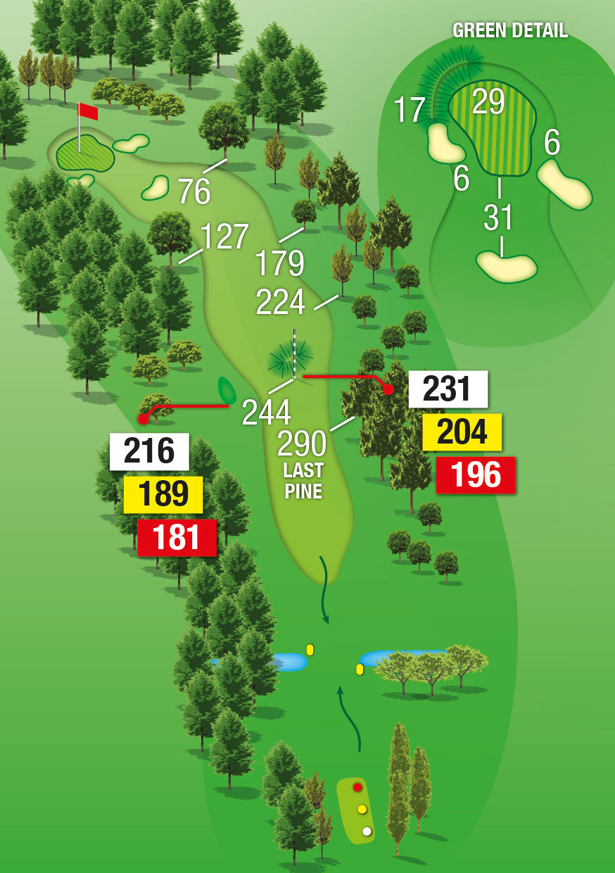 A drive down the right hand side is perfect, but to reach the green you will still need to carry a huge beech tree at the corner of the dogleg.