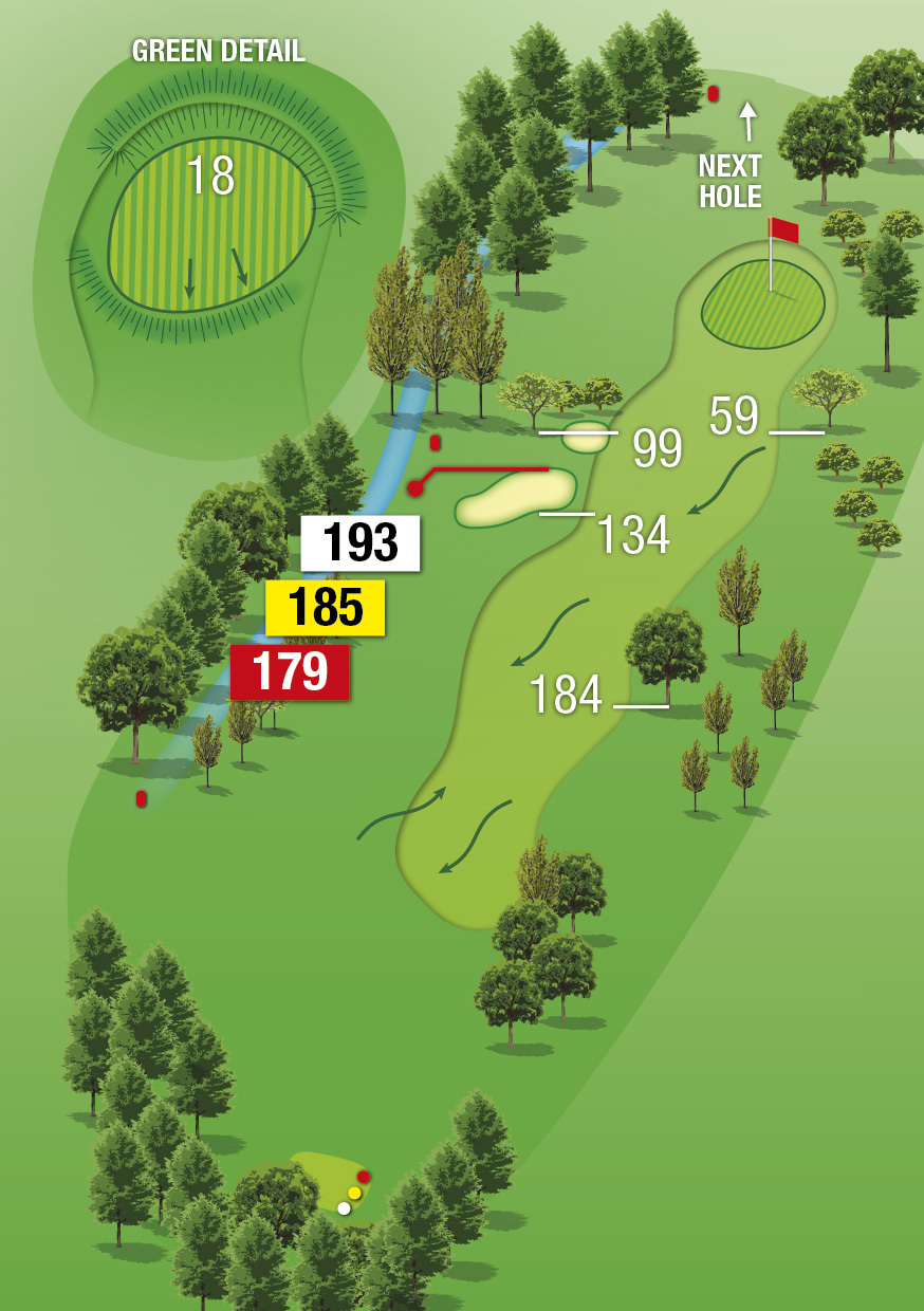 A treacherous green with steep banking at the front. Approach shots pitched on the front third of the green may spin back down the slope, finishing yards away and leaving an awkward up and down to save par.
